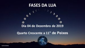 AS LUAS EM DEZEMBRO Dia 04 de Dezembro de 2019, a Lua está na sua Fase de Quarto Crescente a 11° no signo de Peixes.