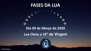 AS LUAS EM MARÇO Dia 09 de Março de 2020, a Lua está na sua fase Cheia a 19° no signo de Virgem. Esta Lua